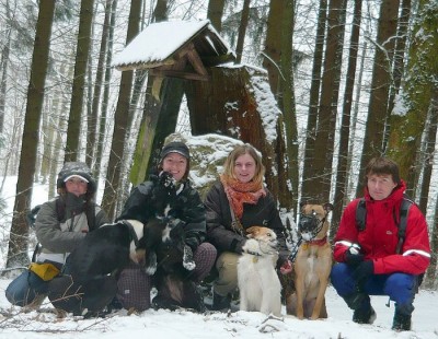 Vrátili jsme se na silnici a tam se rozdělili. Ilča se vracela zpátky do Mariánského a ještě dlohou jsme slyšeli její volání a pískání. Pavel se vydal směrem nahoru, jestli nenatrefí na Jackovi stopy - jěště, že nasněnžilo, a já s Pavlou a psiskama jsme čekali. Když se asi čtvrt hodiny nic nedělo, volala jsem Pájovi, který se zrovna vracel s tím, že našel stopy. Tak jsem volala Ilče, ať jde za náma nahoru, že máme stopu. Ta mi řekla, že se jde podívat k autu, a pak se vydá za náma. To byla další chyba, protože jsme se kvůli tomu zbytečně zdrželi a Jack prchal statečně dál. Po krátké přestávce a rychloporadě s Pájou a Pájou, ze kterých se stala stopovací četa, jsme se domluvili, že budu čekat na Ilču a oni půjdou po stopě. Po pár minutách mi volali, že viděli Jacka. Hurá, není ztracený, tak jsem volala Ilče, ať chváta, že náš cíl byl zaměřen. Jenže ouha, radost předčasná a zbytečná. Než jsem dorazila já, a chvíli po mě Ilča, byl Jack zase v tahu.